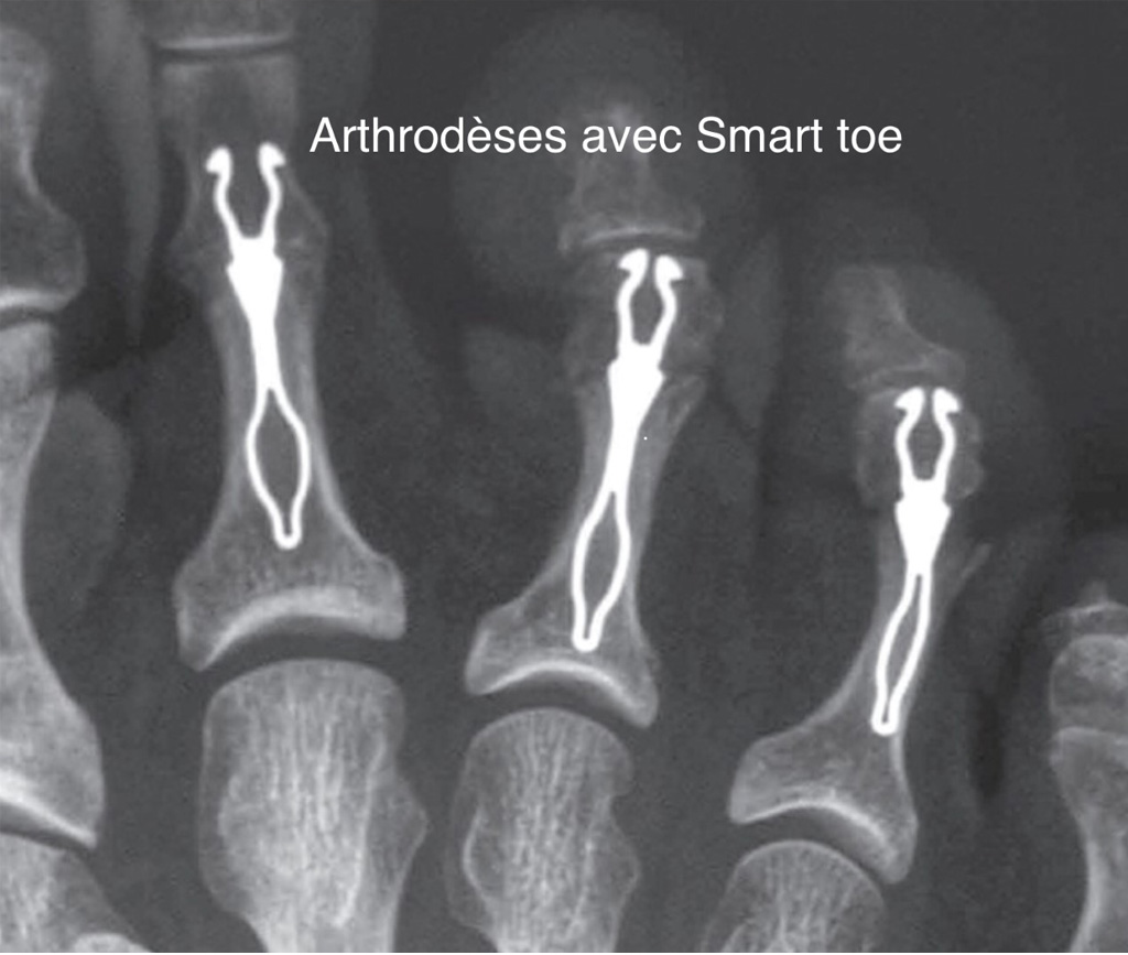 Elles comporteront un abord dorsal identique à l’arthroplastie mais ici, le but est d’obtenir une fusion osseuse entre la 1ère et la 2ème phalange pour une stabilisation définitive. On utilisera une technique de Bilboquet stabilisée par une broche ou, plus volontier, par le biais d’un implant en titane très récemment remboursé par la mutuelle (smart toe).